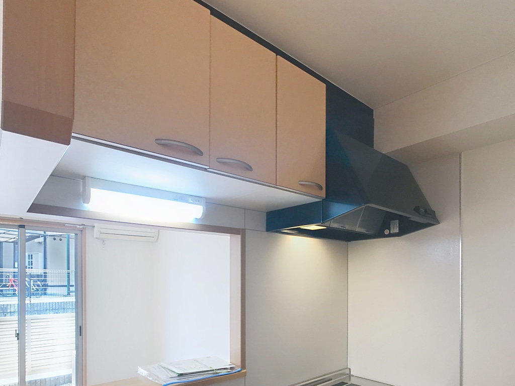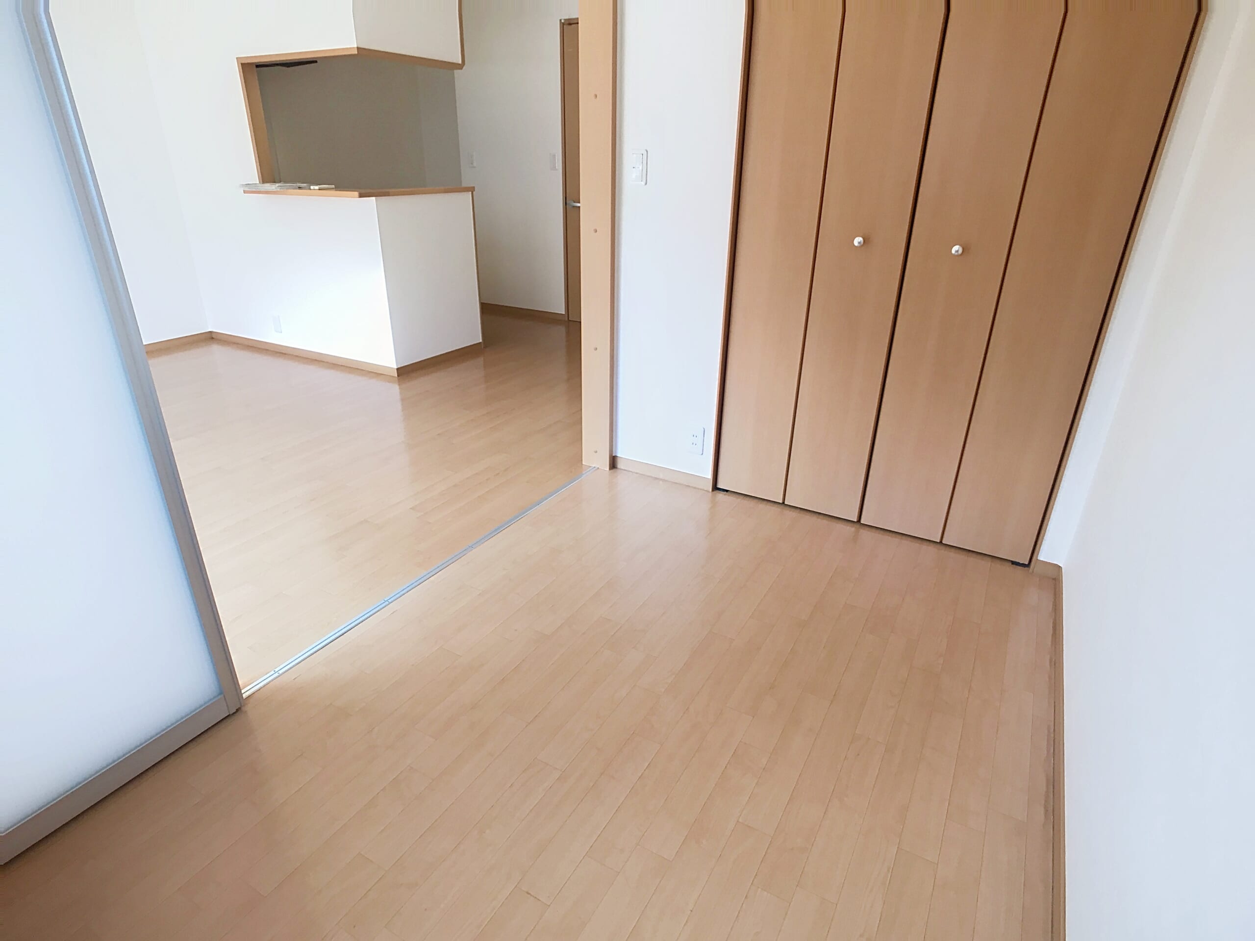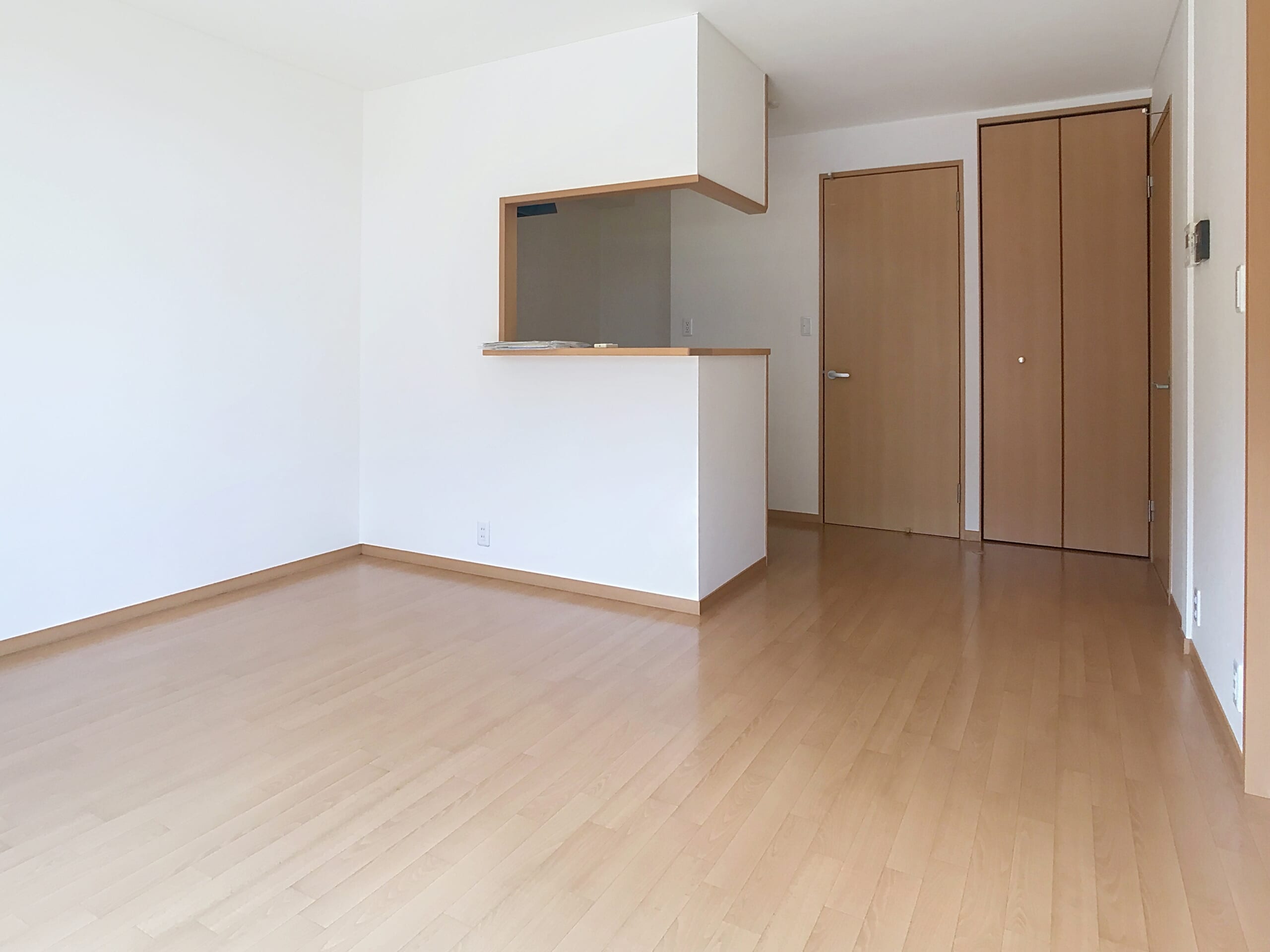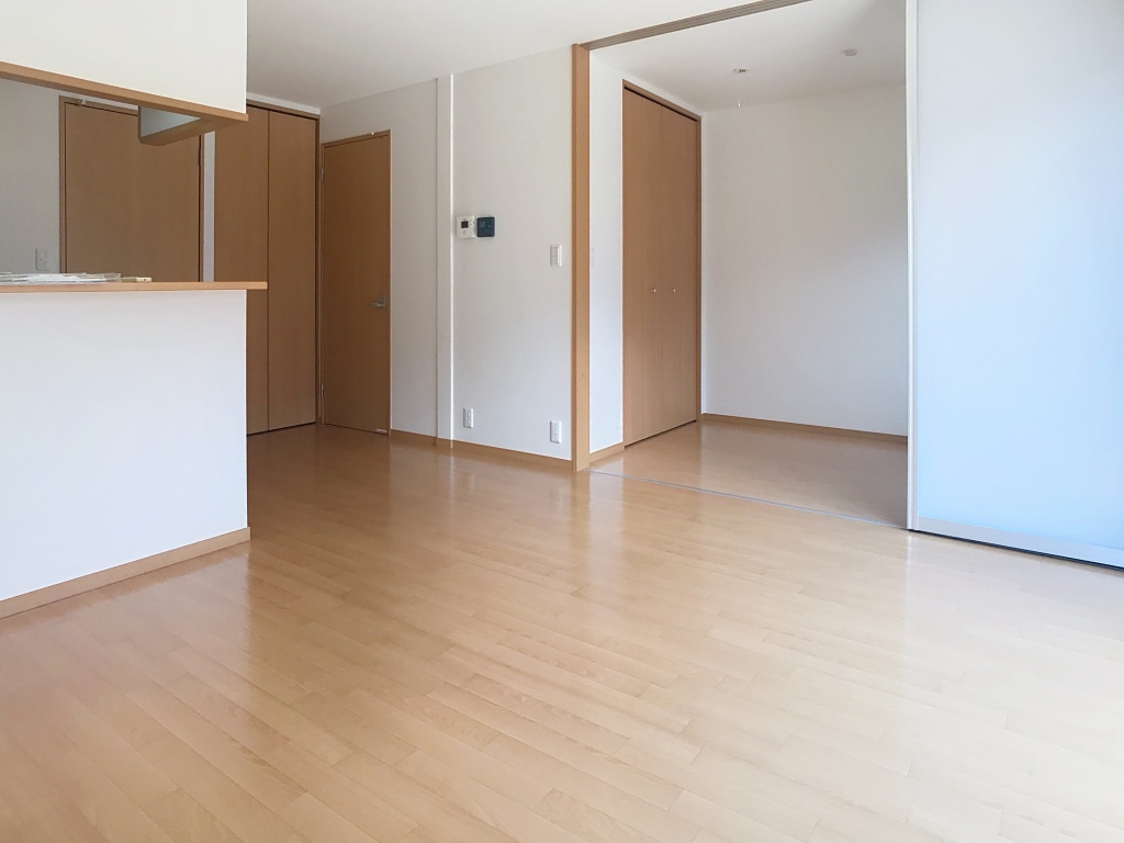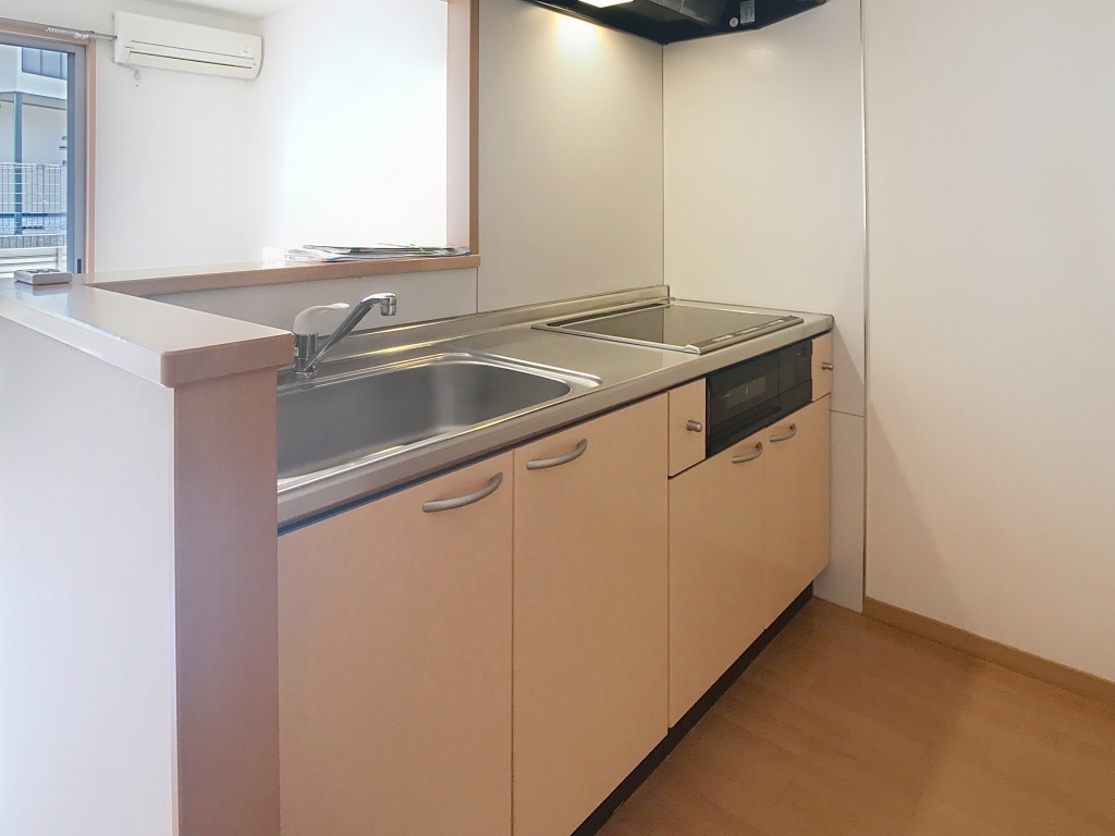カウンターキッチンなので、とても明るいキッチンです!リビングにはソファーをおける広さがあります!